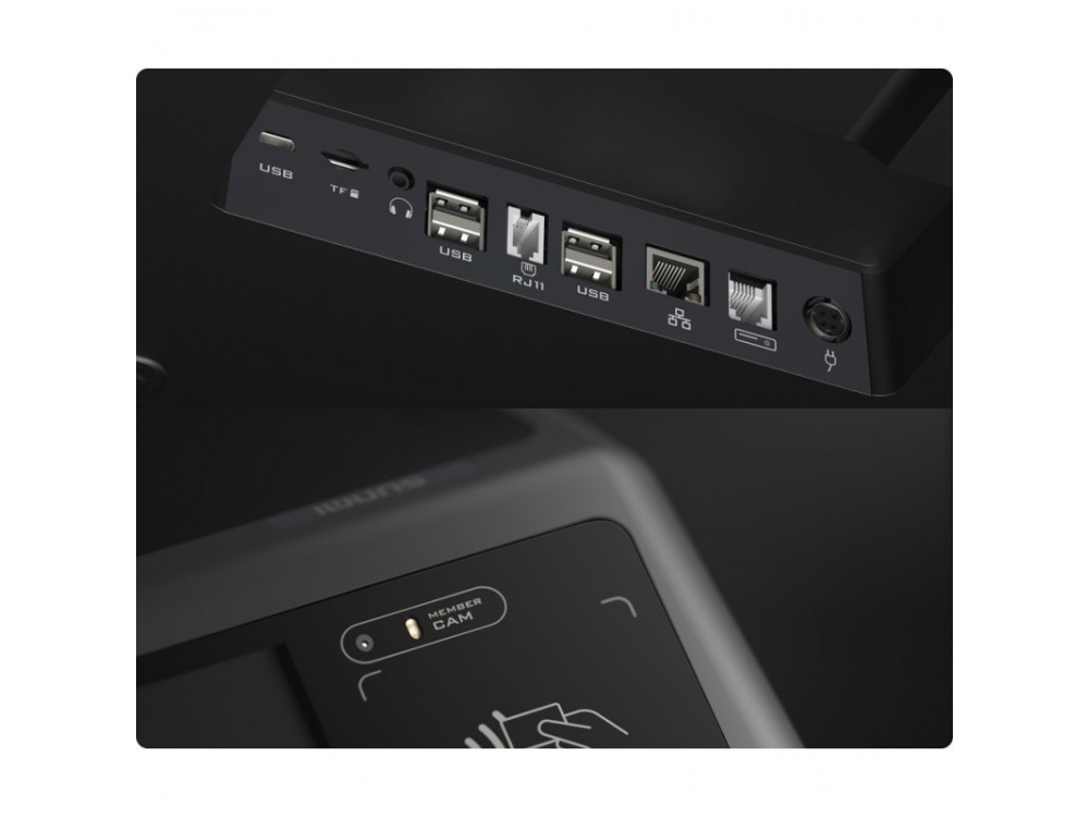 Złącza | Micro USB-B 5xUSB-A (waga, czytnik kodów kreskowych) RJ45 (LAN) RJ12 (szuflada) Czytnik kart micro-SD |