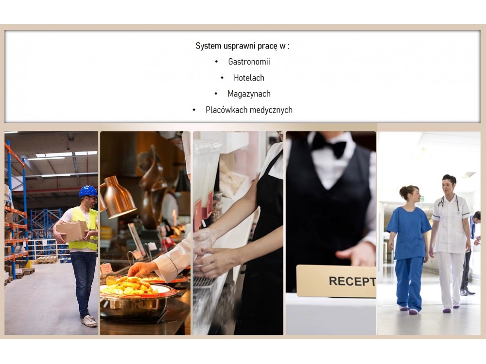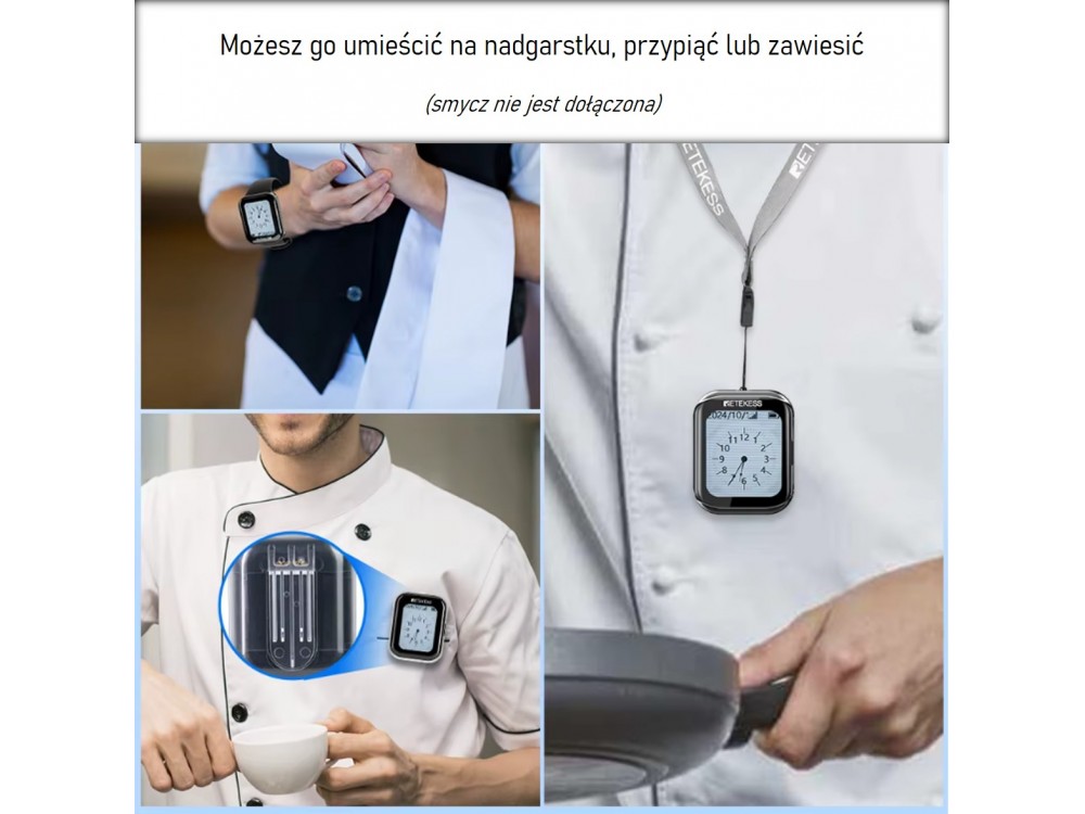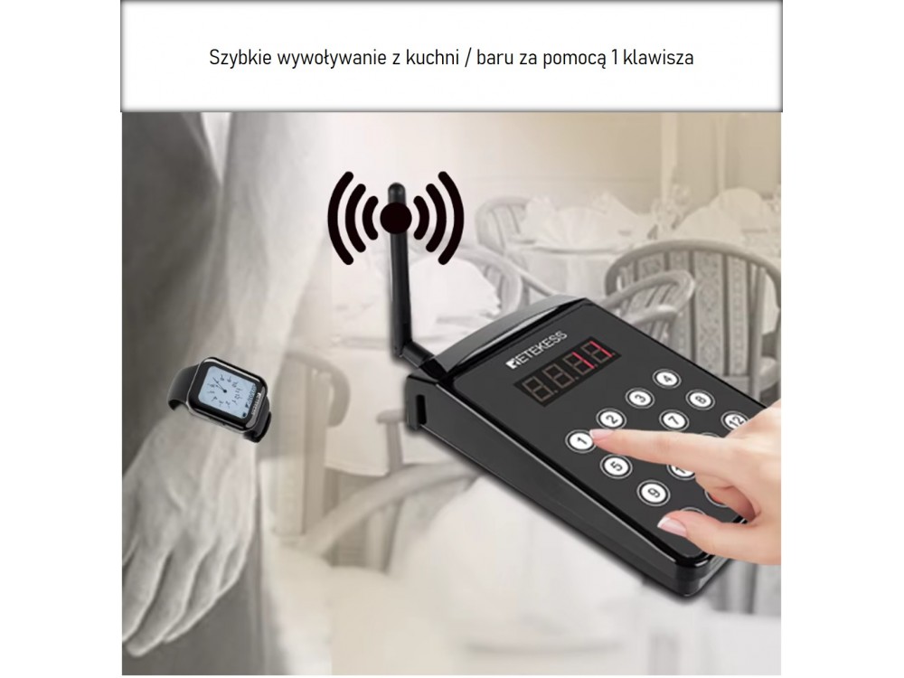Zegarek "kelnerski" - pager, wodoszczelny, do systemu przywołującego. Zegarek może być wywołany przez bazę na kuchni/recepcji lub przez klienta za pomocą guzika na stoliku.