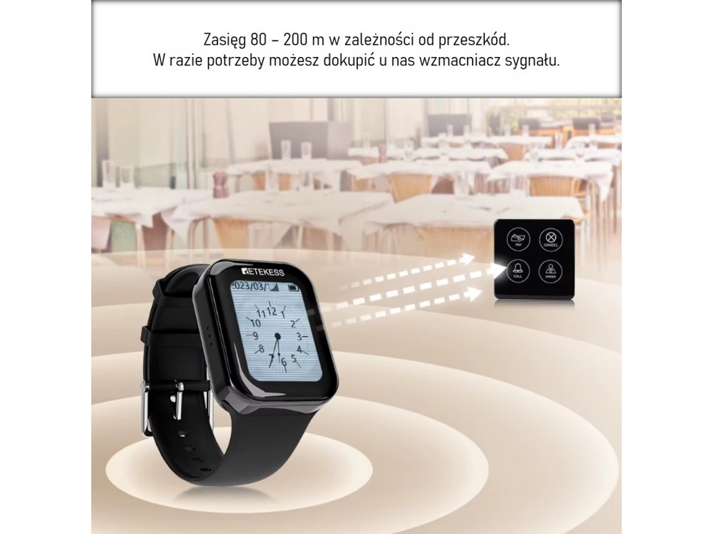 Wspaniałe rozwiązanie dla większych restauracji oraz lokali z ogródkiem. Gdy danie lub napój są gotowe do odbioru wówczas kuchnia / bar wzywa kelnera wybierając w nadajniku odpowiedni numer. Zegarek umieszczony na nadgarstku kelnera wibruje lub wydaje dźwięk. Model 03 dodatkowo jest wodoszczelny.