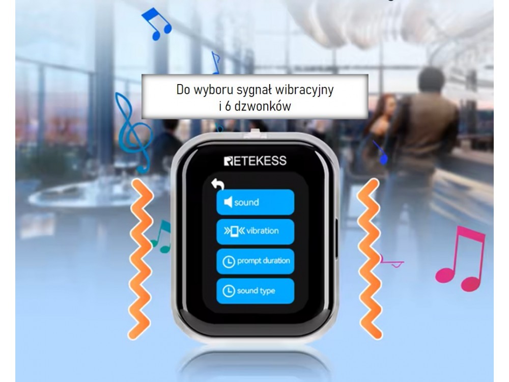 Zegarek "kelnerski" - pager, wodoszczelny, do systemu przywołującego. Zegarek może być wywołany przez bazę na kuchni/recepcji lub przez klienta za pomocą guzika na stoliku.