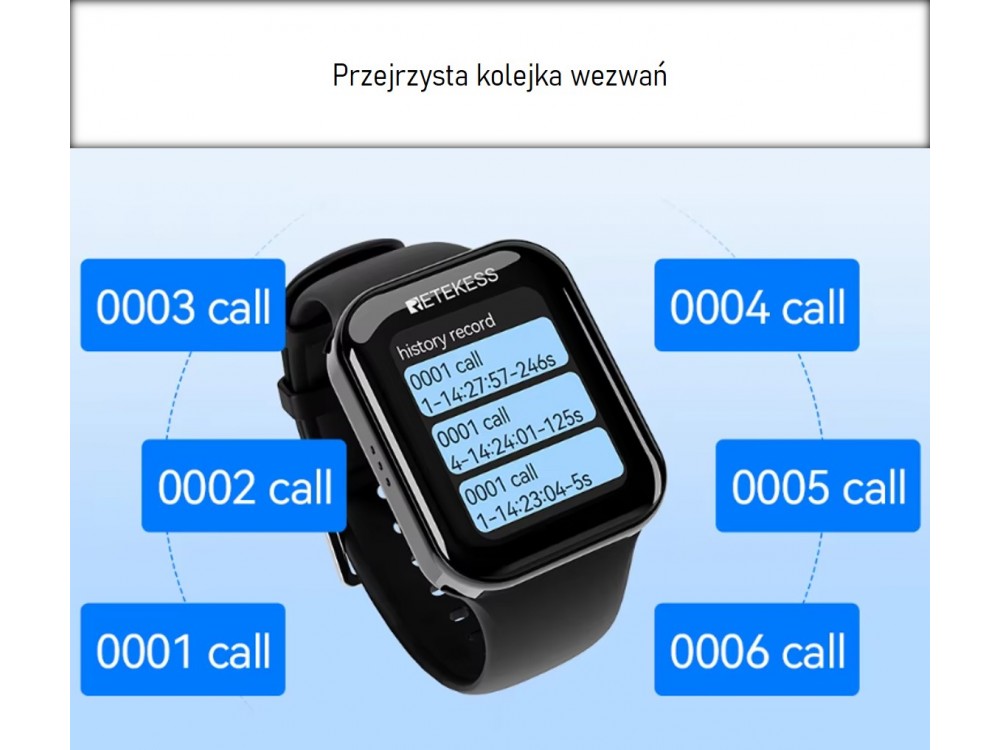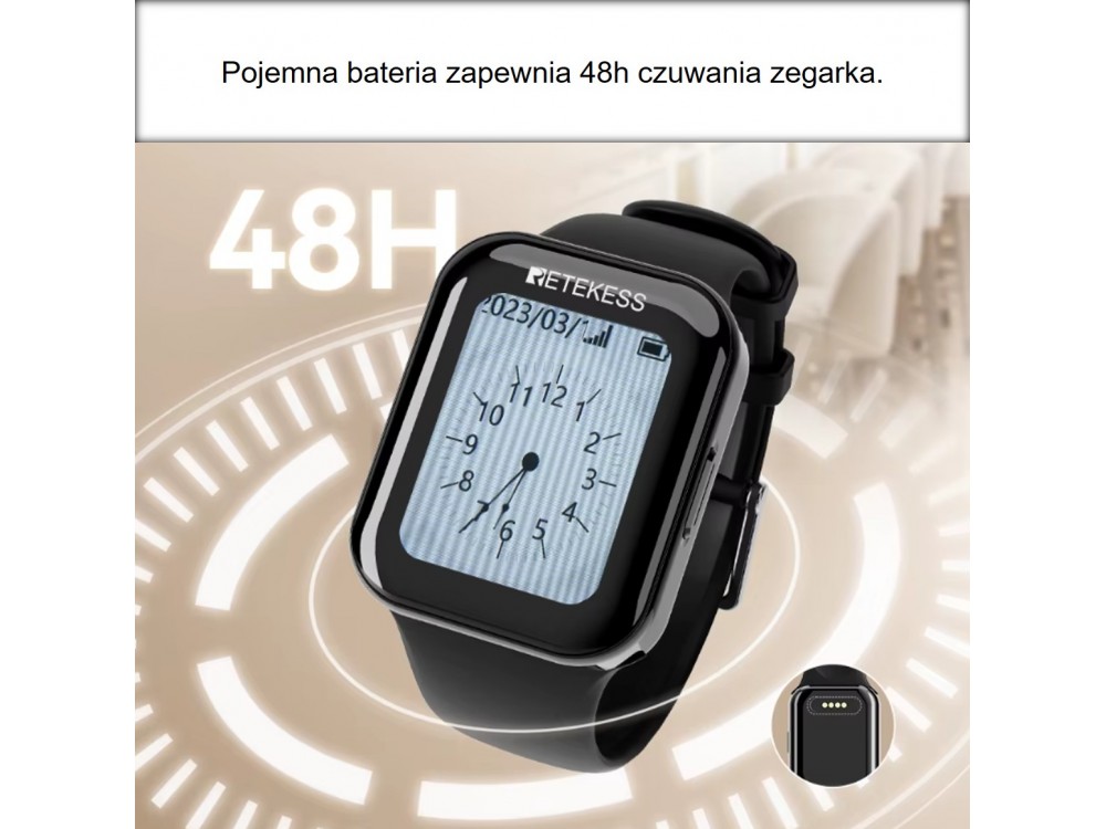 Zegarek "kelnerski" - pager, wodoszczelny, do systemu przywołującego. Zegarek może być wywołany przez bazę na kuchni/recepcji lub przez klienta za pomocą guzika na stoliku.